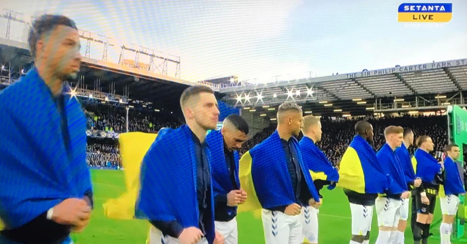 Перед матчем 27-го тура чемпионата Англии футболисты «Ман Сити» вышли на поле в майках с надписями «No war» («Нет войне») и изображениями флага Украины, а игроки «Эвертона» – с флагами Украины на плечах.