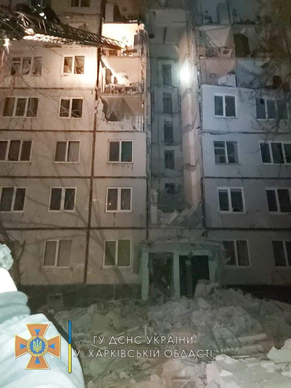 По информации ГСЧС, 26 февраля в 21:20 на номер «101» поступило сообщение о том, что в результате попадания вражеского артиллерийского боеприпаса в жилой 9-этажный дом по адресу: г. Харьков, ул. Бучмы, 40а, произошло разрушение несущей стены лестничной клетки и лестничных маршей со 2-го по 7-й этажи, повреждены строительные конструкции квартир на 4-м, 5-м и 6-м этажах.