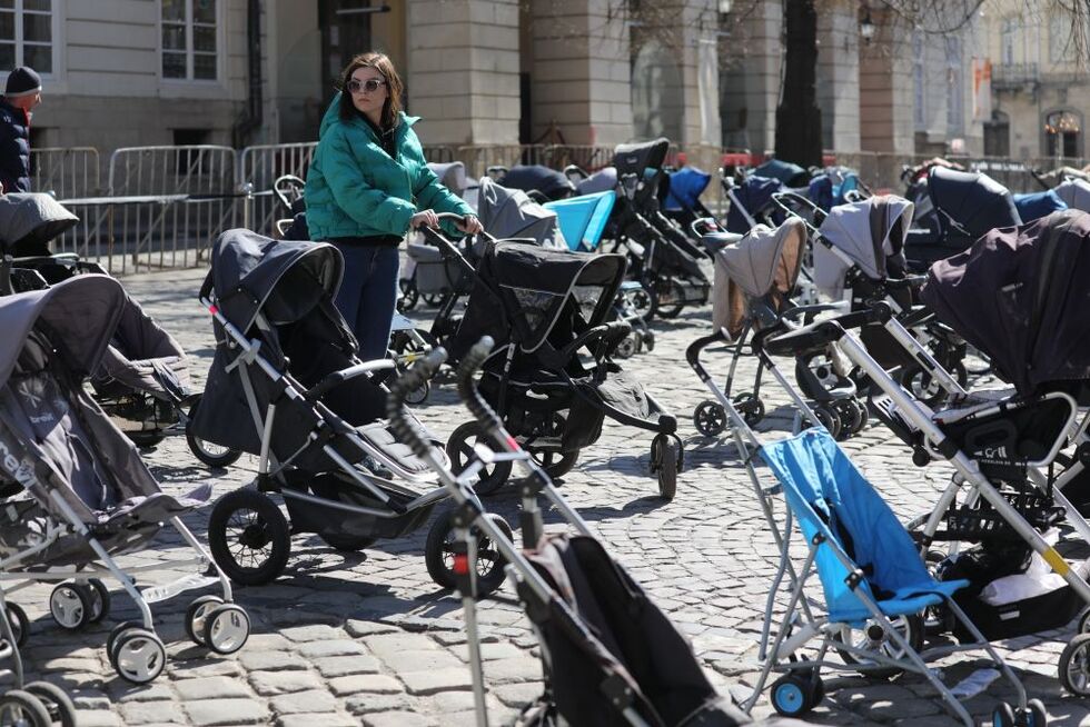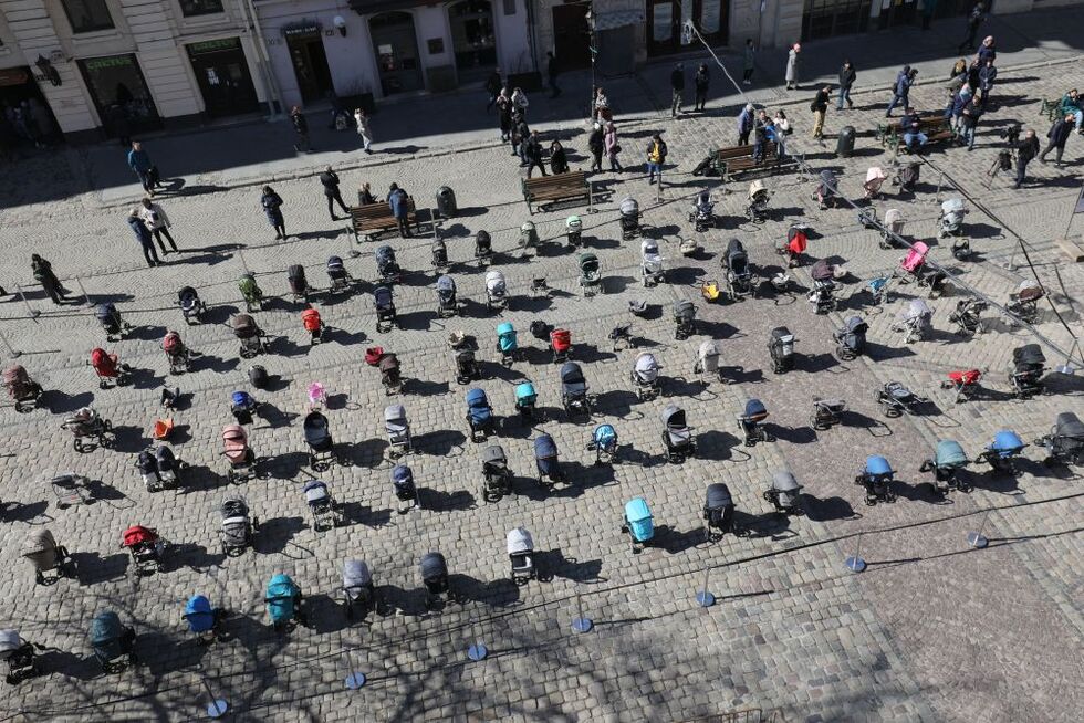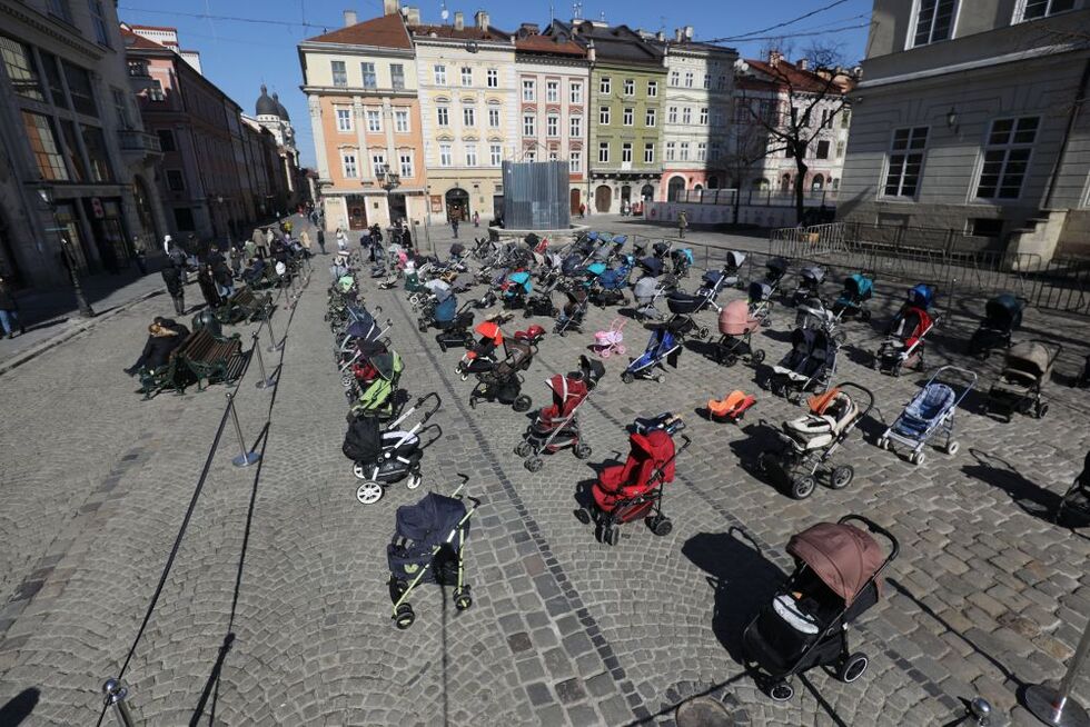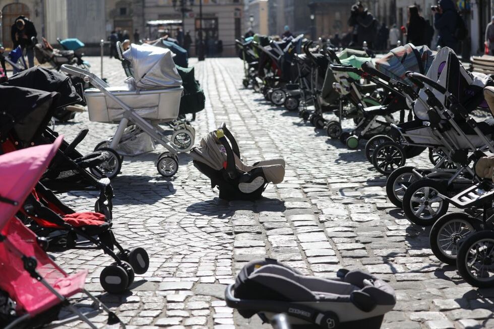 Во Львове на Площади Рынок выставили 109 пустых детских колясок. Именно столько украинских детей российские войска безжалостно убили с начала вторжения.
