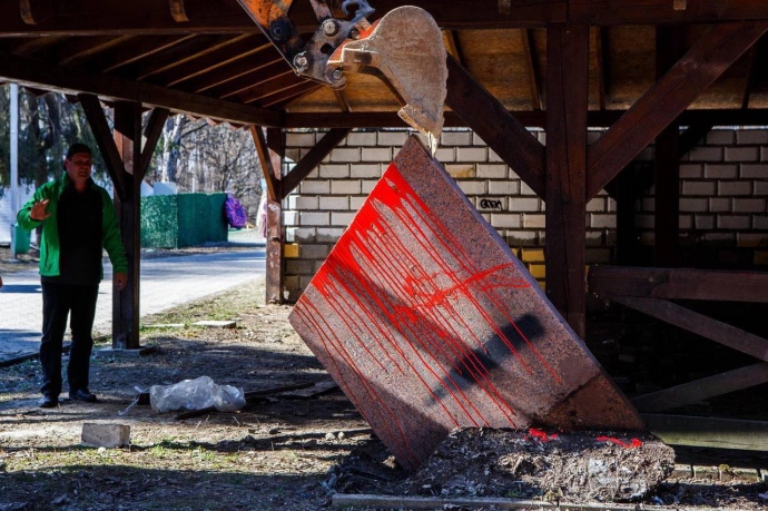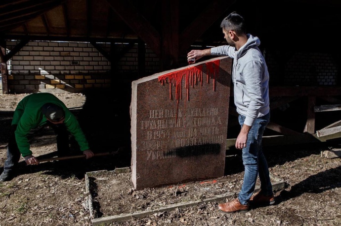 Участники полили памятник красной краской и демонтировали его. Акцию провели историки Ужгородского национального университета.