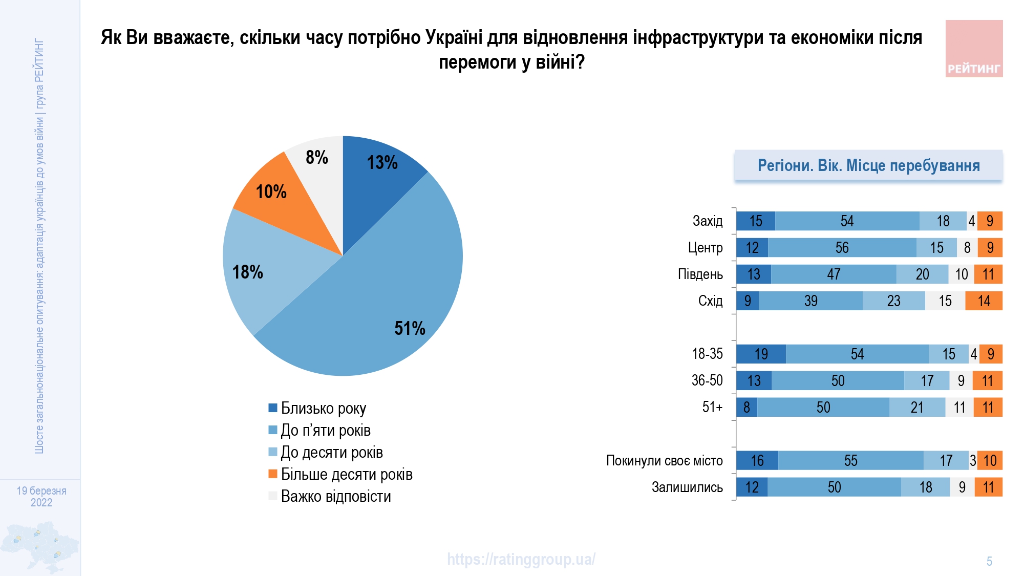 Большинство украинцев довольно оптимистично настроены по восстановлению страны после войны – 51% считает, что хватит 5 лет, 13% - до года.