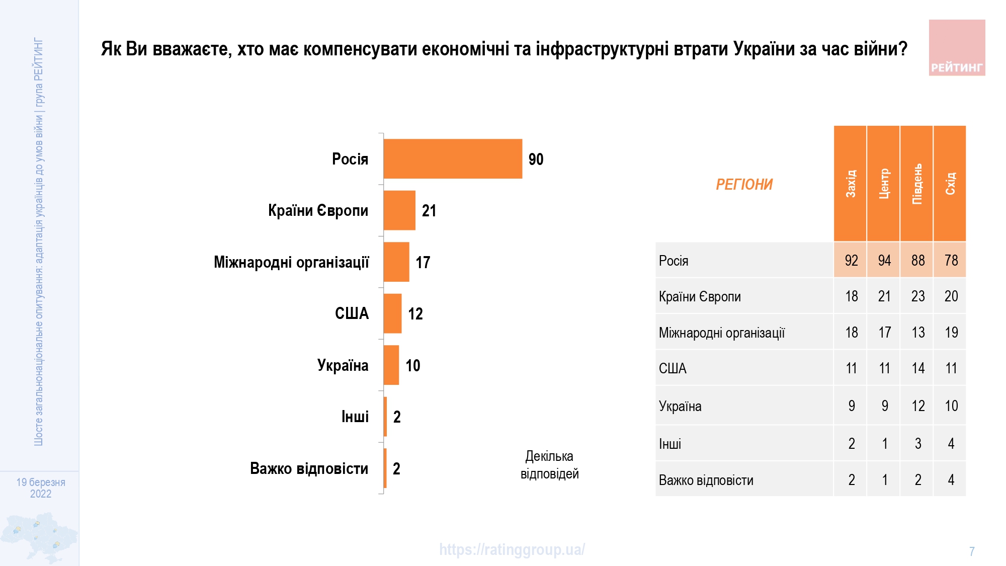 Опрос проведен 19 марта 2022 года по всей Украине за исключением временно оккупированных территорий Крыма и Донбасса. Выборочная совокупность: 1000 респондентов. Метод опроса: CATI (Computer Assisted Telephone Interviews - телефонные интервью с использованием компьютера). Ошибка репрезентативности исследования с доверительной вероятностью 0,95: не более 3,1%.