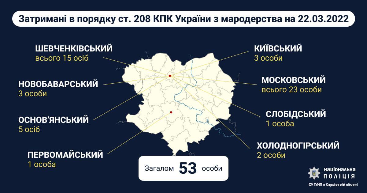 За мародерство в Харьковской области задержали 53 человека. Больше всего – в Московском и Шевченковском районах Харькова. Об этом ообщил начальник следственного управления ГУ Нацполиции Сергей Болвинов.