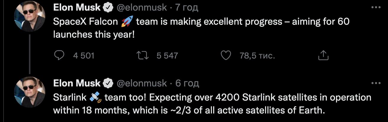 "SpaceX Falcon (основное семейство ракет-носителей компании) отлично прогрессирует - планируем 60 запусков в этом году", - сообщил Маск в Twitter.