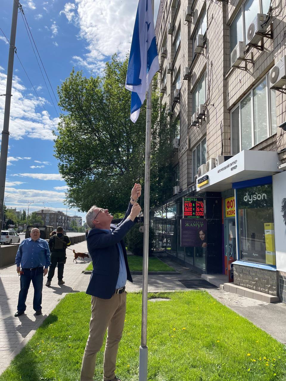 Во вторник, 17 мая, в Киеве возобновило работу посольство Израиля в Украине. Посол Михаил Бродский поднял флаг возле здания дипломатического представительства.