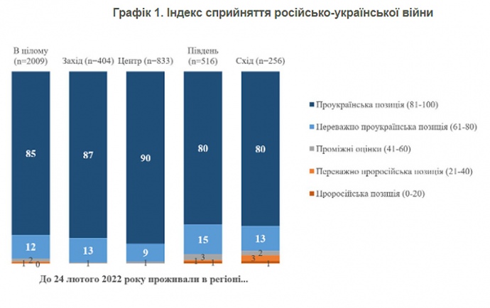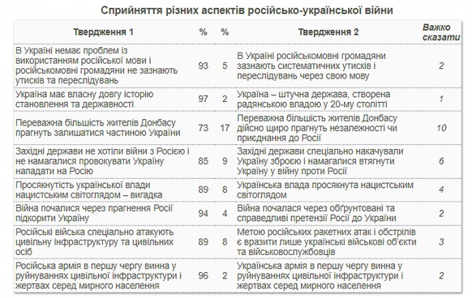 "Не менее 85% респондентов считают, что в Украине нет притеснений русскоязычного населения (в частности, так считают 85% этнических россиян и 90% русскоязычных жителей Украины), что Украина имеет собственную длинную историю становления и государственности (а не является "искусственным" творением советской власти), что западные государства не хотели и не провоцировали Украину на войну против России.