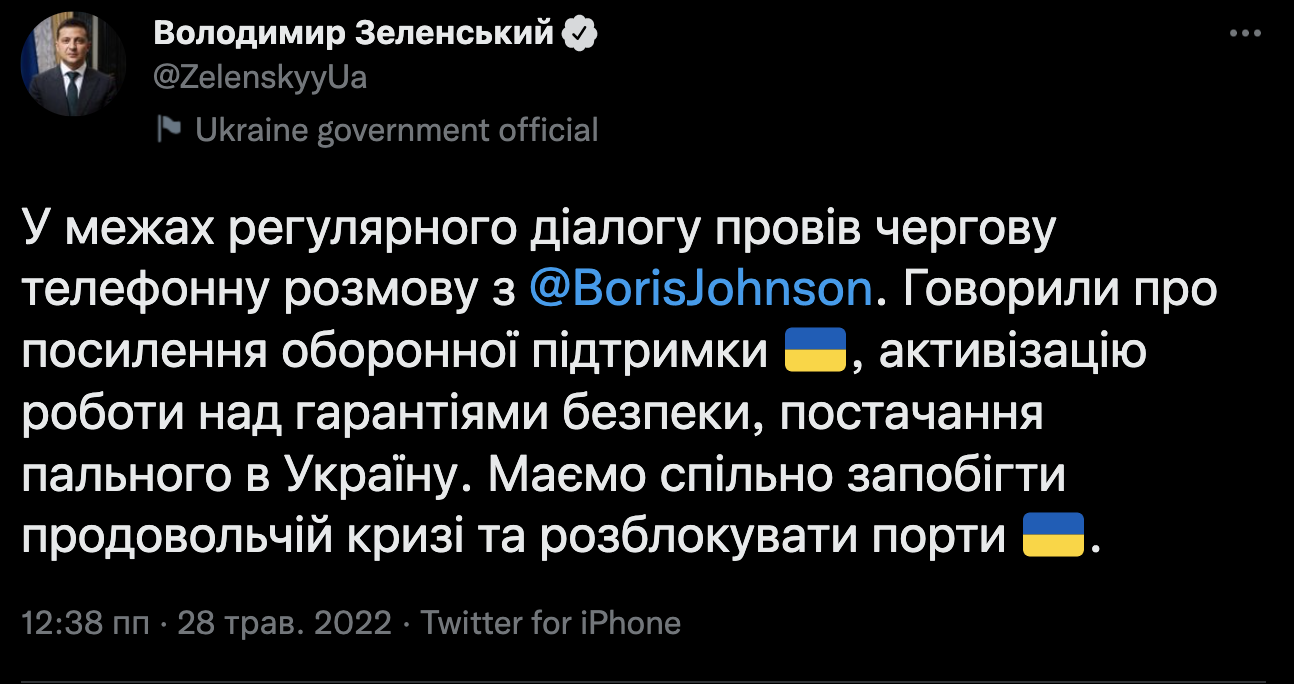 "В рамках регулярного диалога провел очередной телефонный разговор с Борисом Джонсоном. Говорили об усилении оборонной поддержки Украины, активизации работы над гарантиями безопасности, поставках топлива в Украину. Должны совместно предотвратить продовольственный кризис и разблокировать украинские порты", — твитнул Зеленский.