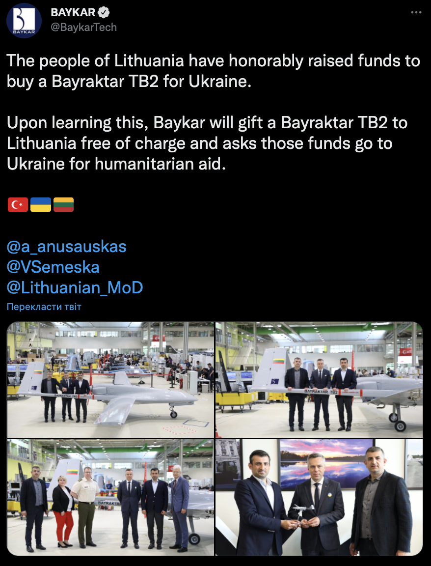 "Жители Литвы собрали деньги, чтобы купить для Украины Bayraktar TB2. Узнав об этом "Байкар" бесплатно подарит Литве Bayraktar TB2 и просит эти средства передать Украине на гуманитарную помощь", - сообщается в Twitter производителя БПЛА.