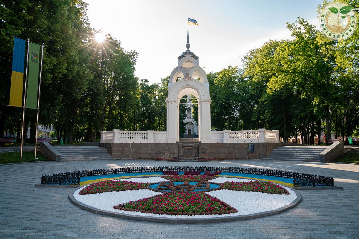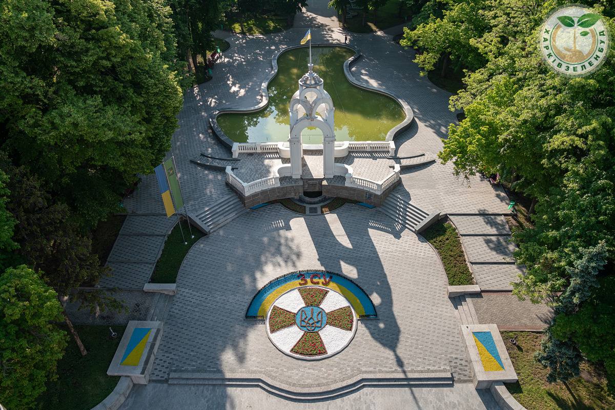 Сотрудники "Харьковзеленстрой" возле "Зеркальной струи" создали цветочное панно, посвященное Вооруженным Силам Украины.
