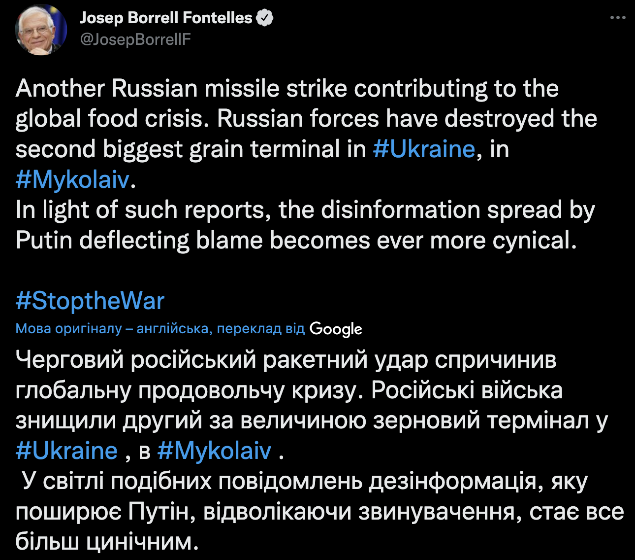 Глава евродипломатии Жозеп Боррель обвинил Россию в уничтожении зернового терминала в Николаеве, который является одним из крупнейших в Украине комплексом по перевалке зерна.