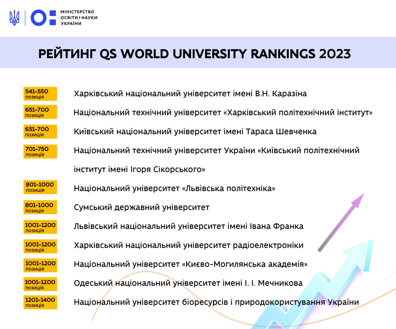 Самую высокую позицию в рейтинге среди украинских ВУЗ-ов занимает Харьковский национальный университет имени В.Н. Каразина (541-550 позиция).