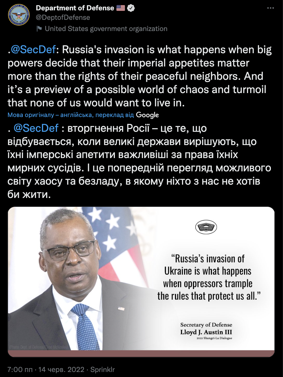 В официальном Twitter американского оборонного ведомства появилась цитата его главы Ллоида Остина: