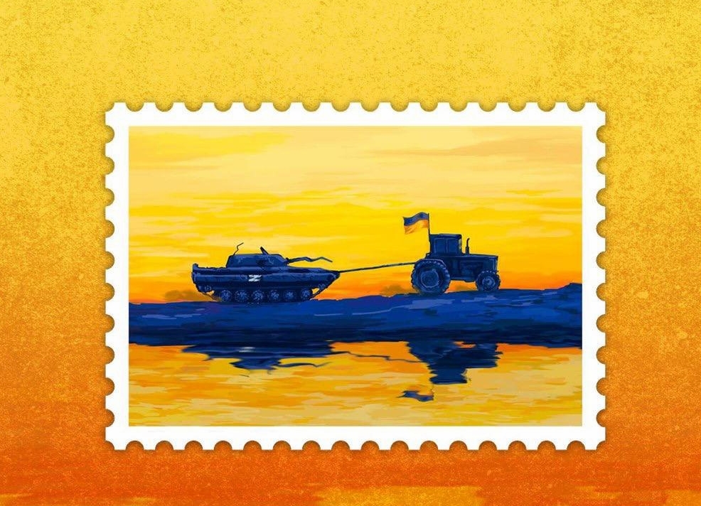 За эскиз новой марки "Доброго вечора, ми з України!" проголосовали 340 тыс. из 834 тыс. участников голосования, на нем трактор тянет российский металлолом.