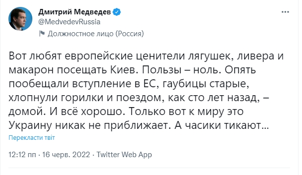 Заместитель председателя Совета безопасности РФ экспрезидент РФ Дмитрий Медведев пренебрежительно высказался о лидерах Франции, Германии и Италии в связи с их визитом в Киев.
