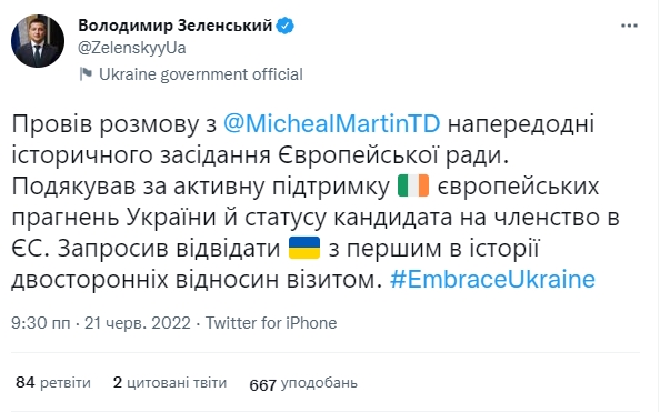 "Провел разговор с премьер-министром Майклом Мартином в преддверии исторического заседания Европейского совета. Поблагодарил за активную поддержку Ирландией европейских стремлений Украины и статус кандидата на членство в ЕС. Пригласил посетить Украину с первым в истории двусторонних отношений визитом", - написал Зеленский в Twitter.