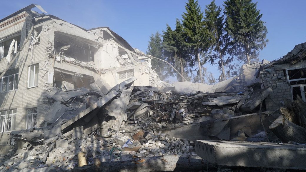 Спасатели проводят работы по разборке завалов бетонных остатков конструкций, плит и других строительных материалов. По предварительным данным, было два попадания, в здании учебного заведения не было никого. Тип ракеты устанавливает полиция.