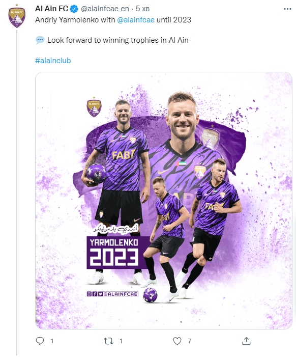 В арабский клуб Ярмоленко перешел на правах свободного агента, статус которого получил по истечении срока действия контракта с Вест Хэмом. Контракт украинца с Аль-Айном рассчитан на год.