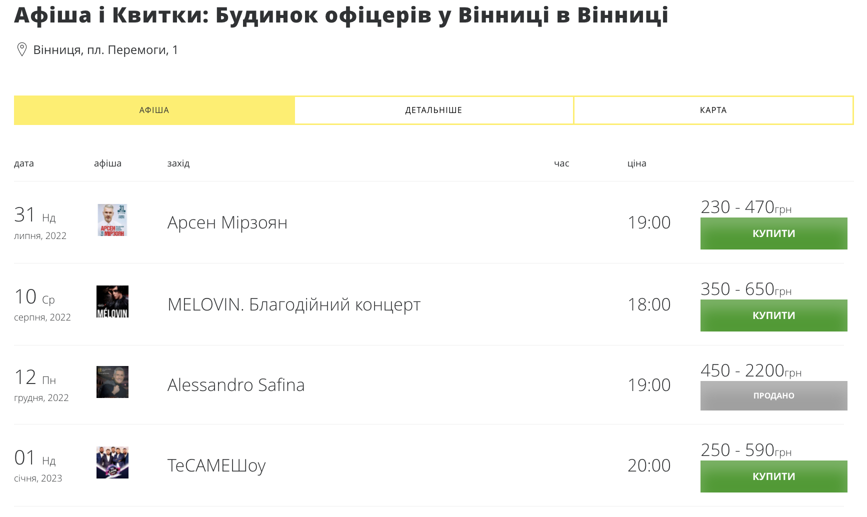 При этом здание Дома офицеров в Виннице используется как концертный зал и культурный центр – на профильных сервисах по-прежнему рекламируются билеты на запланированные там мероприятия: