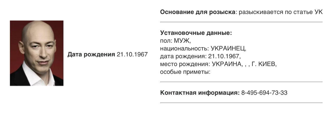 МВС Росії оголосило у розшук українського журналіста Дмитра Гордона. Інформація про це з'явилася в основі розшуку відомства.