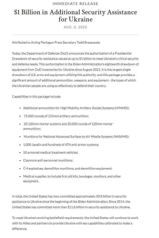 Міністерство оборони США оголосило про додатковий 1 мільярд доларів на безпекову допомогу Україні.