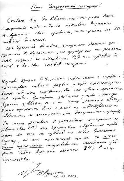 Ця брехлива вигадка, запущена Вашим заступником Р.Кузьміним, не ґрунтується на реальній моїй позиції як підсудного. Під час судових дебатів я дослівно заявив наступне: “Я не потребую жалості. Я нічого не прошу, навіть у суду. Я все одно виживу, скільки б мені не написали цих років, я все одно вийду і залишуся таким, яким є. Прокуратура мене звинувачувала, що я не каюсь - так, я не каюсь. Я не бачу жодного злочину, який вчинив. Я не бачу підстав вибачатися і каятися. Мені багато за що є вибачатися політично, але юридичних злочинів я не скоював”.