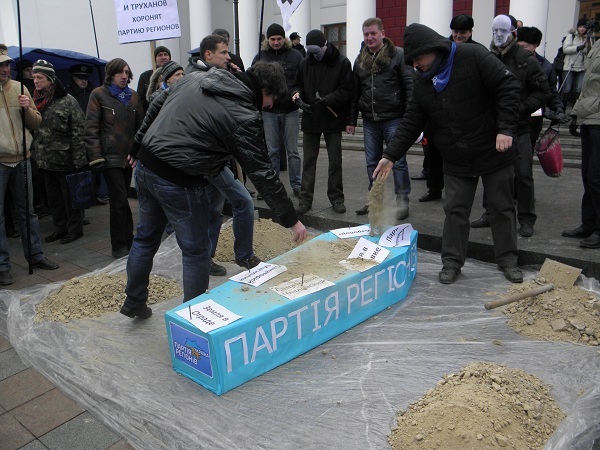 "Рейтинг Партии регионов уже давно падает со скоростью пикирующего бомбардировщика. Мы только делаем этот процесс публичным, – заявил глава организации Алексей Черный. – И хороним в земле, которую они воруют".