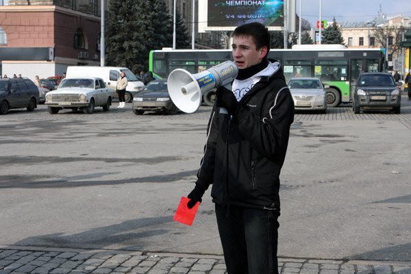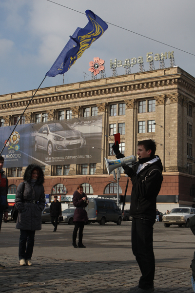 Сегодня на площади Свободы в Харькове представители организации «Студенческая «Свобода» в рамках Всеукраинской акции «Вставай! Покажи януковичам «красную карточку» провели свой перфоманс.