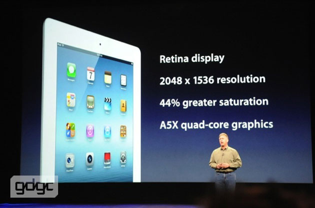 От планшетов предыдущего, второго поколения, устройство отличают более мощный процессор (A5X, который по производительности вдвое опережает A5), а также новый экран Retina с разрешением 2048 на 1536 пикселей (плотность пикселей - 264 на дюйм). Цвета на новом экране выглядят более насыщенными, подчеркнул вице-президент Apple Фил Шиллер.