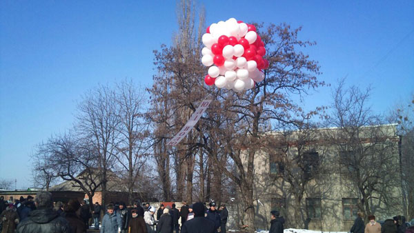 Как сообщает корреспондент "Главного", забор колонии украшен цветами. Собравшиеся - около 200 человек - исполняют национальный Гимн и украинские песни.