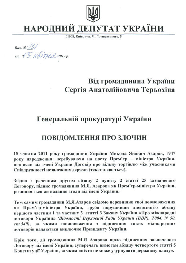 Народный депутат от «БЮТ-Батьківщини» Сергей Терехин обратился в Генеральную прокуратуру с сообщением о преступлении, совершенным премьер-министром Николаем Азаровым при подписании 18 октября 2011 года от имени Украины договора о свободной торговле со странами СНГ.
