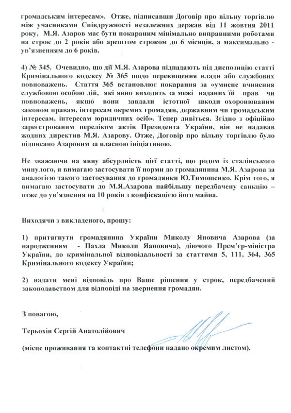 Терехин уверен, что действия Азарова подпадают под действие ст. 365 Уголовного кодекса (превышение служебных полномочий), а также 111 (государственная измена), поскольку договор ограничивает суверенитет Украины.