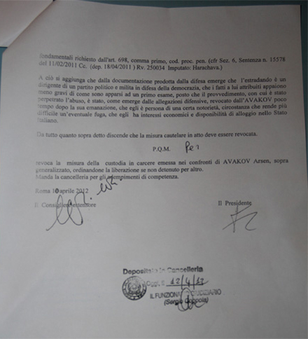 На вопрос о сообщении ГПУ, в котором прокуратура заявляла, что Аваков находится под домашним арестом, Оливьеро ответил: "Эта новость является полностью фальшивой. Хочу отметить, что лишь судья компетентен в вопросе ограничения свободы, и он его освободил из-под стражи, не наложив никакого ограничения. И я предоставляю Вам копию этого решения суда (см. ниже – ред.), где в резолютивной части сказано следующее: "(Суд) отзывает меру пресечения содержания под стражей, примененную к Авакову Арсену, личные данные которого указаны выше, постановляя его освободить, если он не заключен под стражу за другое". Как видите - нет ни одного упоминания о домашнем аресте".