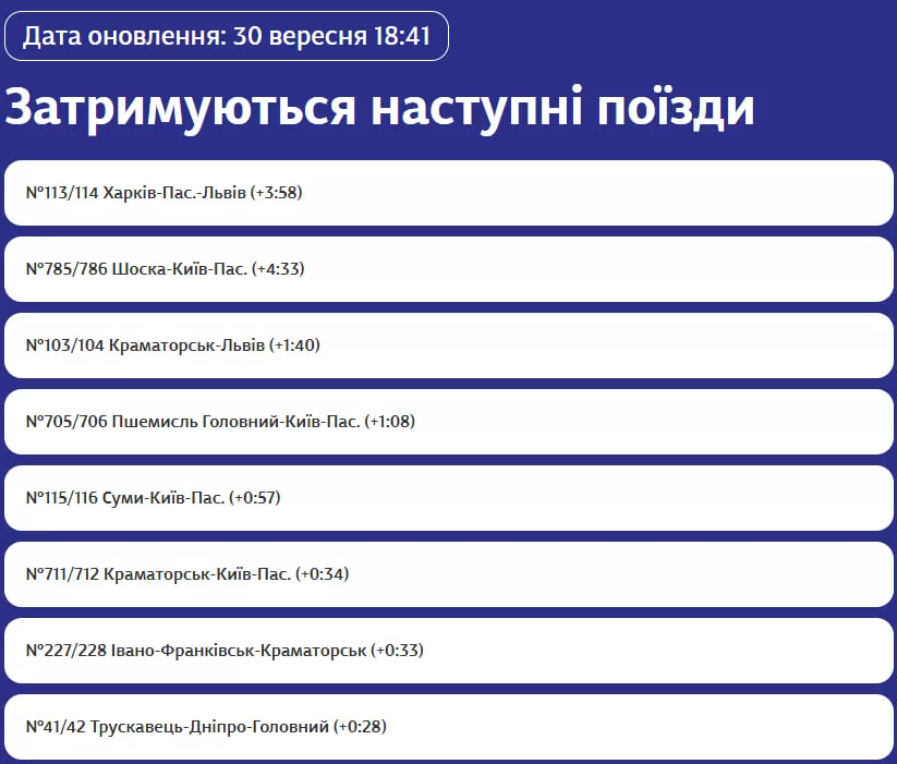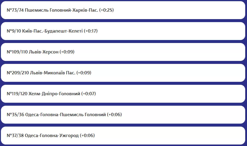 Найбільш значуще відхилення від графіка наразі має поїзд №143 Суми – Львів (сім годин). У зворотному напрямку поїзд №144 Львів – Суми також вирушить із запізненням.