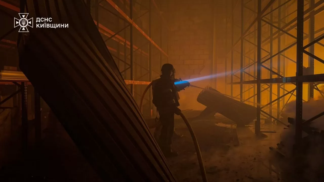 Рятувальники повідомили, що унаслідок нічної ворожої атаки БПЛА у місті Яготин Бориспільського району виникла пожежа на території складського комплексу.