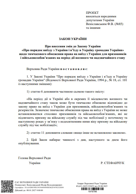 На сайті Верховної Ради з’явився текст законопроєкту, який пропонує дозволити виїзд за кордон чоловікам віком до 24 років.