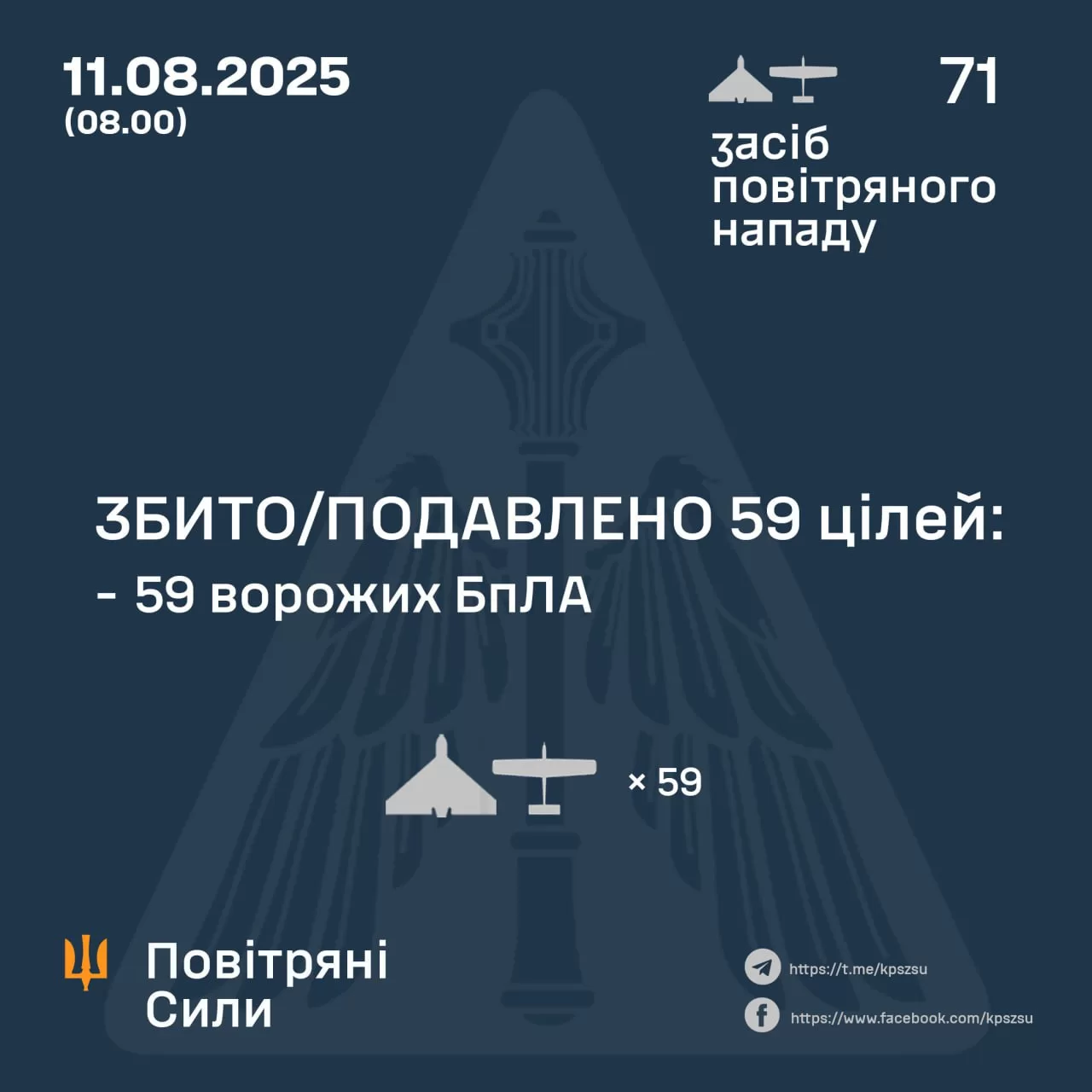 У ніч на 11 серпня, починаючи з 20:30 10 серпня, РФ атакувала Україну 71 ударним БпЛА Shahed і безпілотниками-імітаторами різних типів із напрямків Шаталово, Курськ, Міллерово, Приморсько-Ахтарськ.