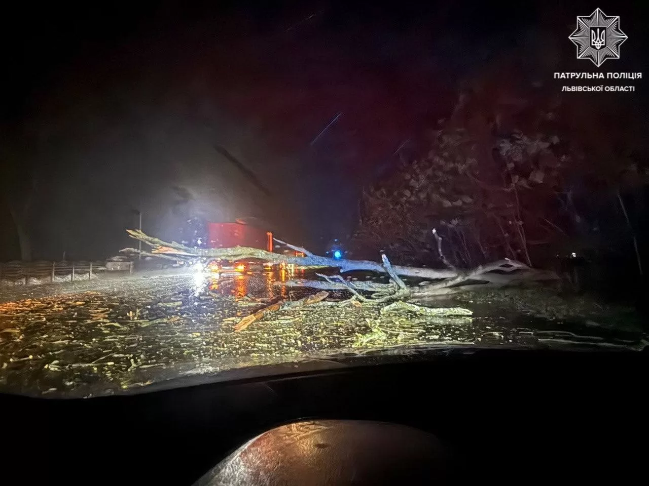 За даними патрульних, уночі на дорогах виникали ускладнення через повалені дерева та ДТП.