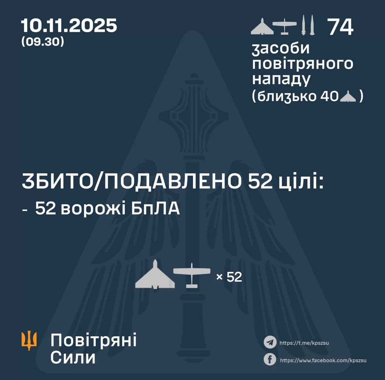 У ніч на 10 листопада росія атакувала Україну двома аеробалістичними ракетами Х-47М2 «Кинджал», п’ятьма зенітними керованими ракетами С-300/С-400 та 67 ударними безпілотниками типу Shahed, «Гербера» й інших моделей. Про це повідомили Повітряні сили ЗСУ.