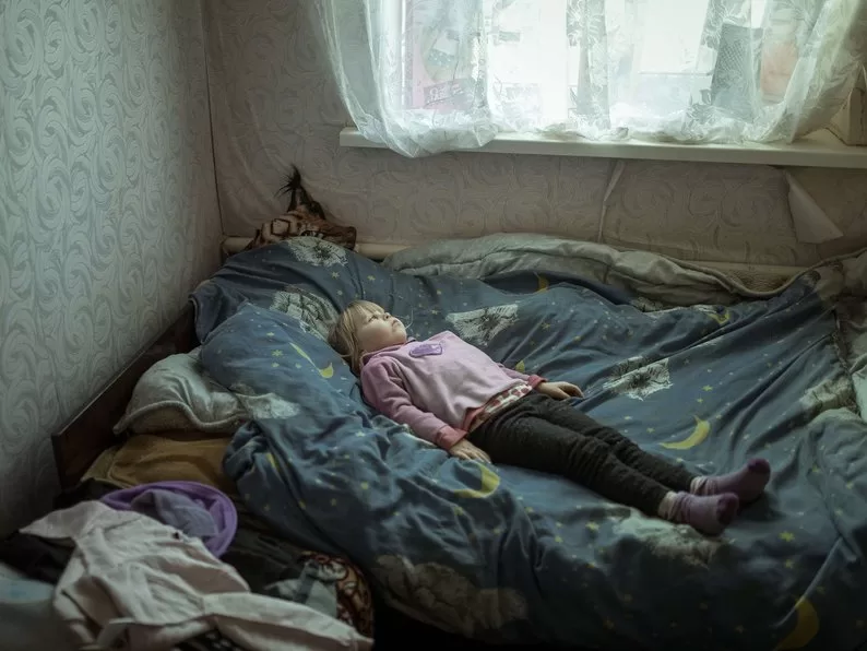 Поряд з пораненим терористом опублікували світлину “Позаду траншей” німецького фотографа Флоріана Бамаєра, на якій показали шестирічну дівчинку Анжеліну, яка лежить у своєму помешканні в Борщівці Харківської області й страждає від панічних атак, спричинених російськими обстрілами.