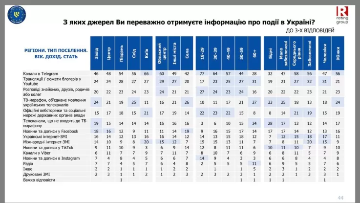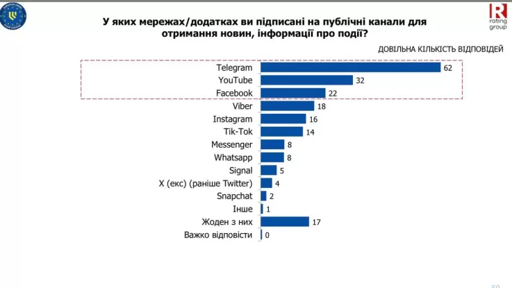 Більшість українців отримують інформацію про події в країні з каналів у Telegram. Про це свідчать результати свіжого опитування, проведеного дослідницькою групою «Рейтинг».