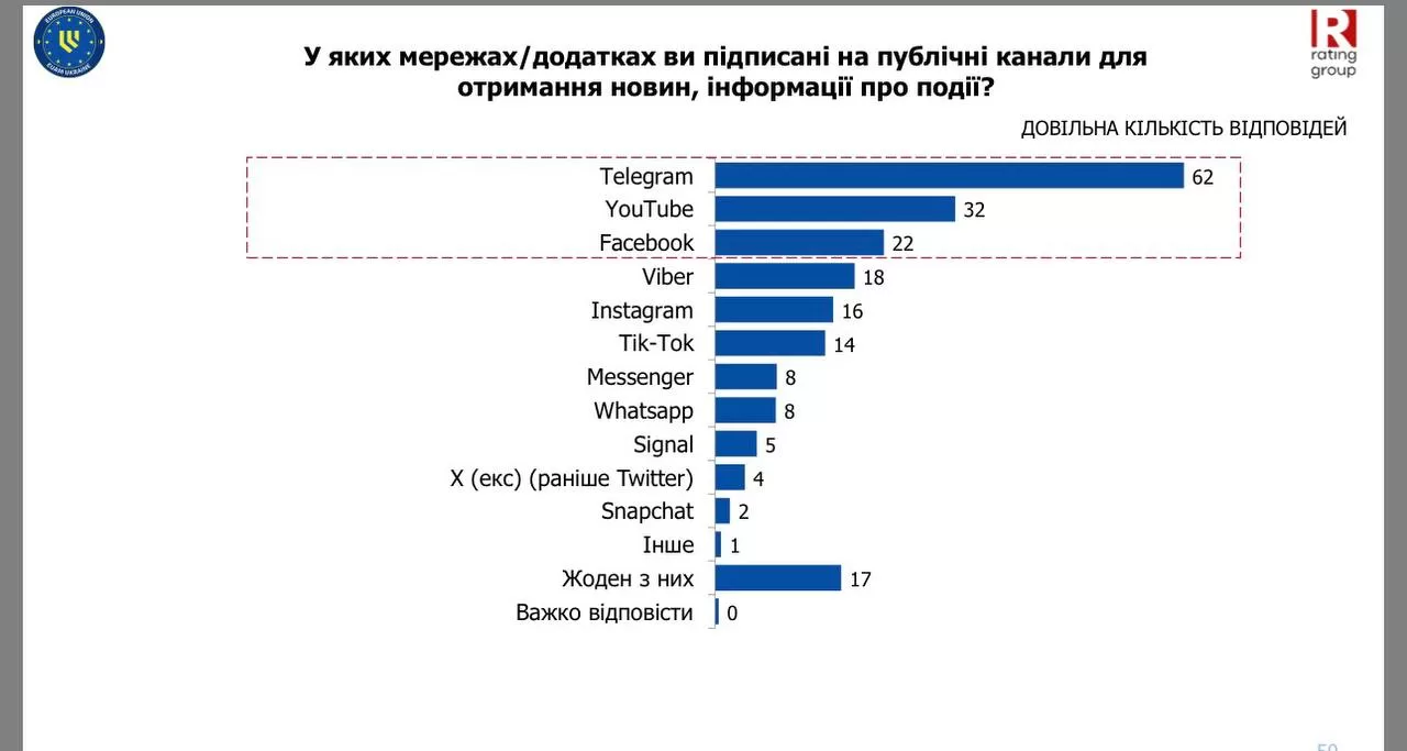 Серед соцмереж, на які українці підписані для отримання новин, знову лідирує Telegram (62%), далі — YouTube (32%) та Facebook (22%). Менш популярними є Viber (18%), Instagram (16%) та TikTok (14%).