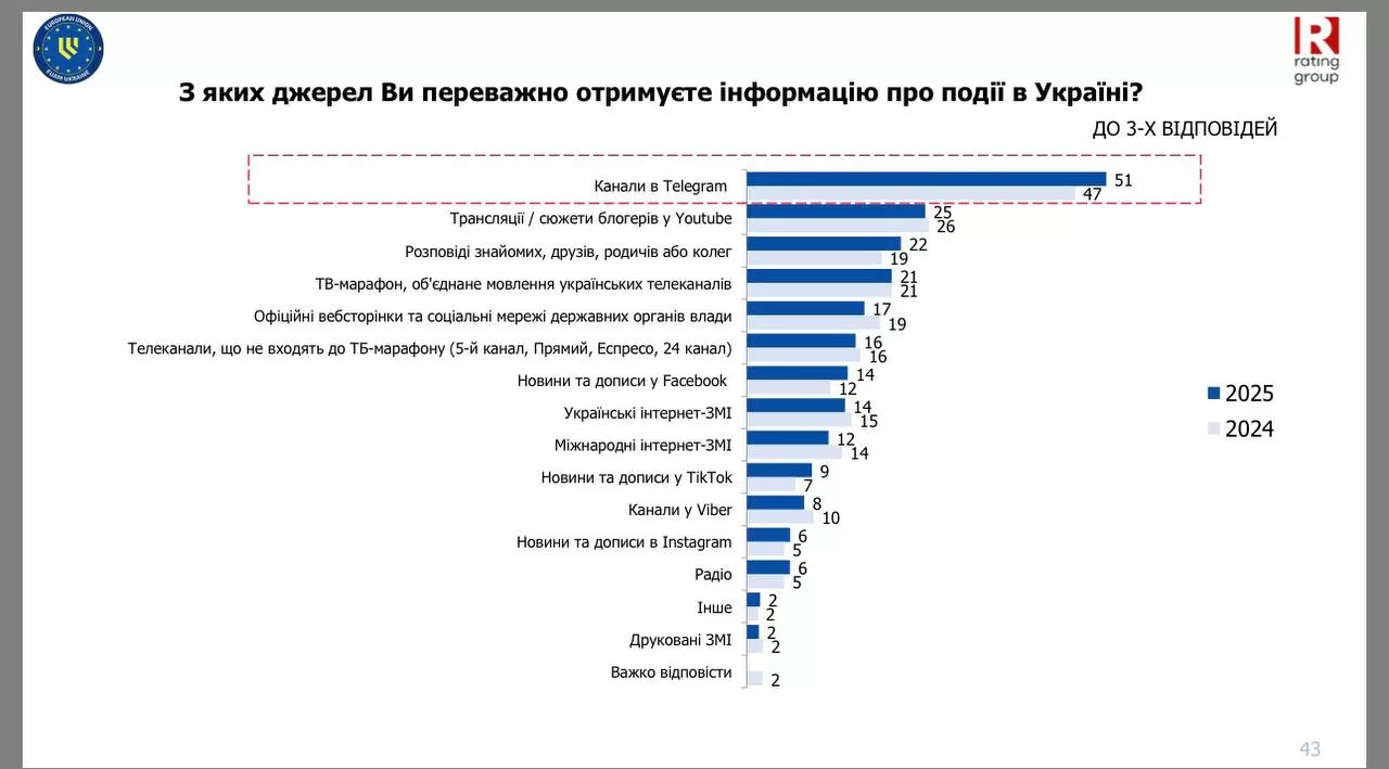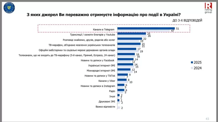 За даними опитування, у 2025 році 51% респондентів назвали Telegram основним джерелом новин (у 2024-му таких було 47%). На другому місці — трансляції та сюжети блогерів у YouTube (25%), далі йдуть розповіді знайомих і родичів (22%) та телемарафон українських телеканалів (21%).