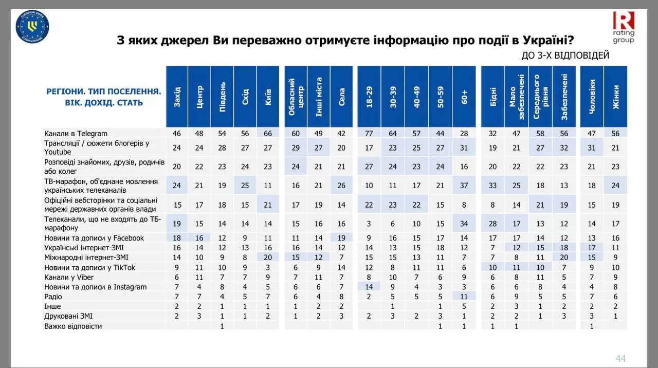 • молодь 18–29 років найбільше довіряє Telegram (77%), тоді як серед старших людей (60+) цей показник становить лише 28%;