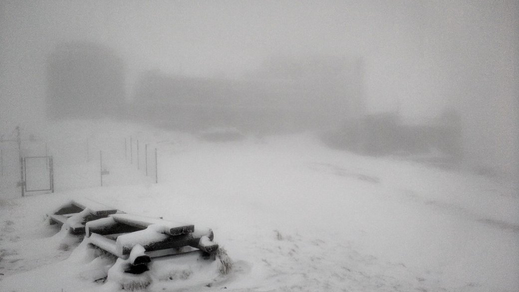 На горі Піп Іван Чорногірський у Карпатах випав сніг, температура повітря опустилася до -6°. На вершині — обмежена видимість та туман.
