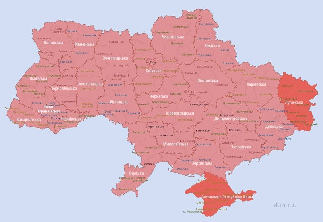 Повітряна тривога оголошена по всій Україні. Це виходить з мапи тривог України.