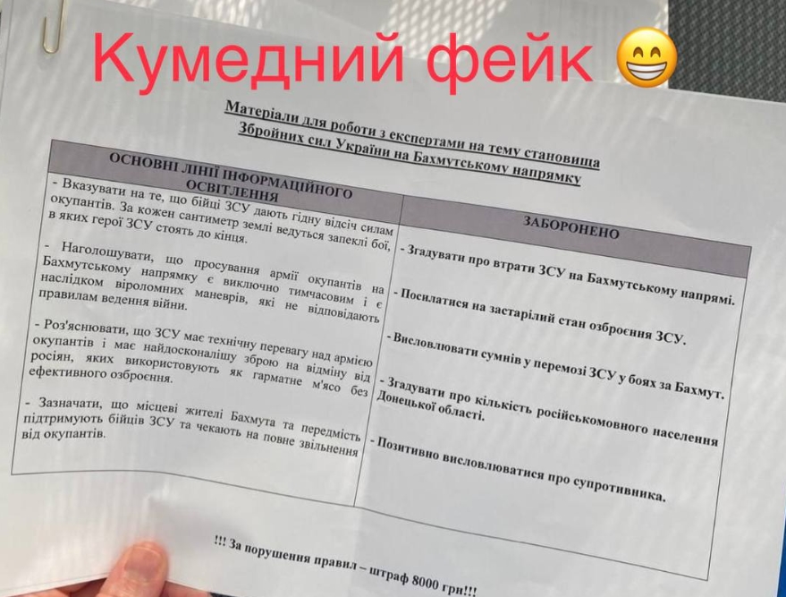 При цьому в так званій фейковій “методичці” міститься низка заборон, як-от: згадувати про втрати українських сил; позитивно висловлюватися про росіян та сумніватися у перемозі українських захисників у боях за місто.