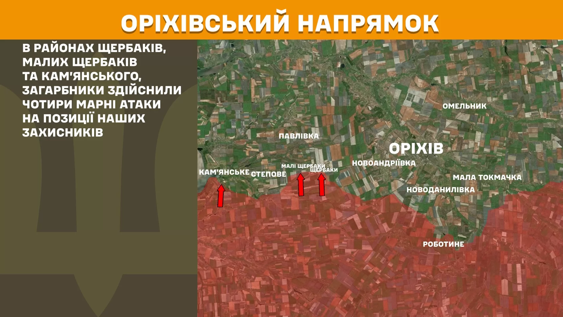 На Оріхівському напрямку, в районах Щербаків, Малих Щербаків та Кам’янського, загарбники здійснили чотири марні атаки на позиції українських захисників.