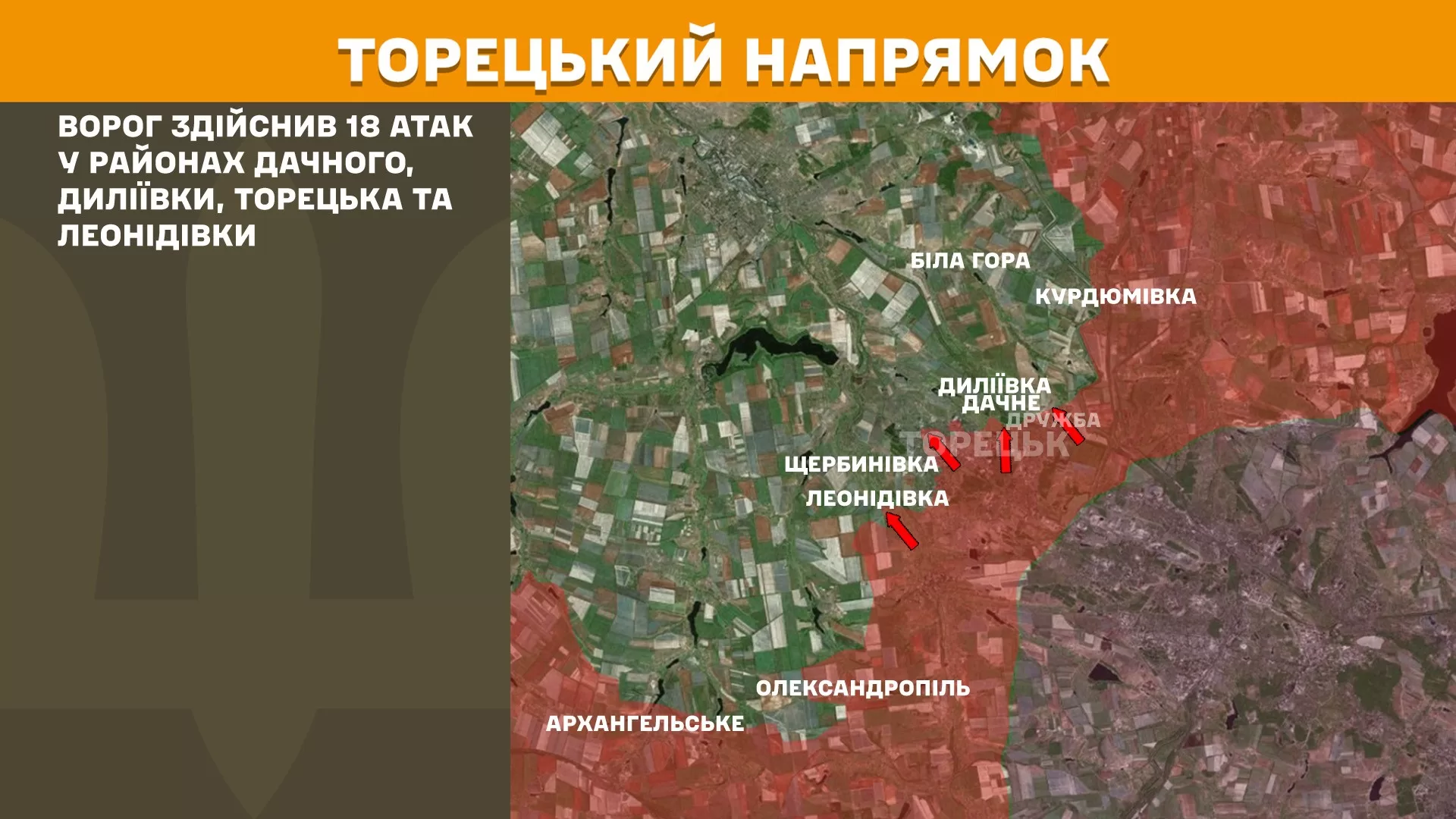 На Торецькому напрямку ворог здійснив 18 атак у районах Дачного, Диліївки, Торецька та Леонідівки.