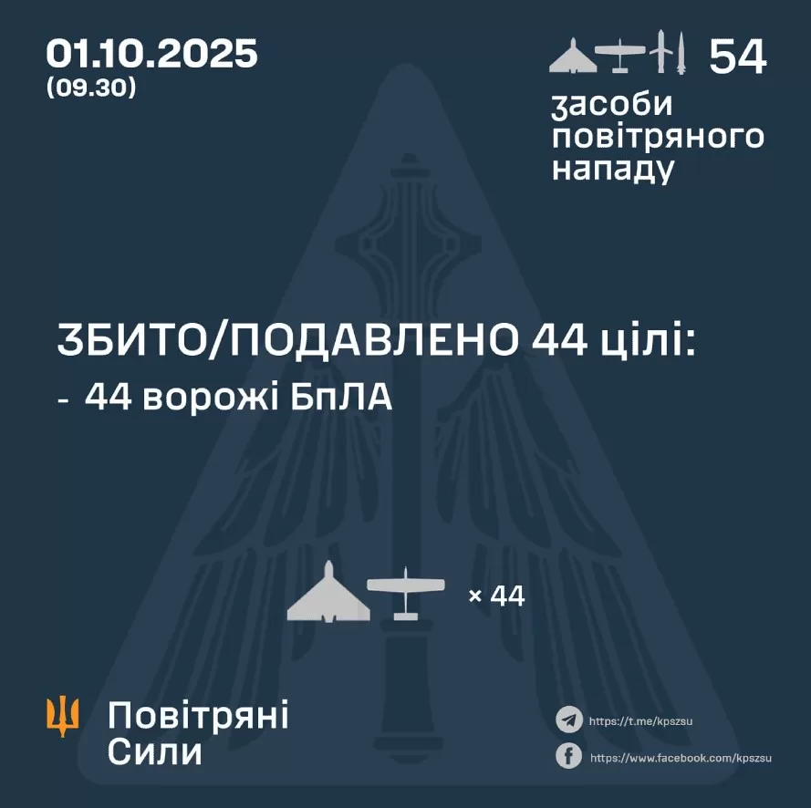 У ніч на 1 жовтня російські війська здійснили комбіновану атаку на територію України, застосувавши 49 ударних безпілотників типу Shahed, «Гербера» та інших, а також ракети «Онікс» і «Іскандер-М/KN-23». Про це повідомили у Повітряних Силах ЗСУ.