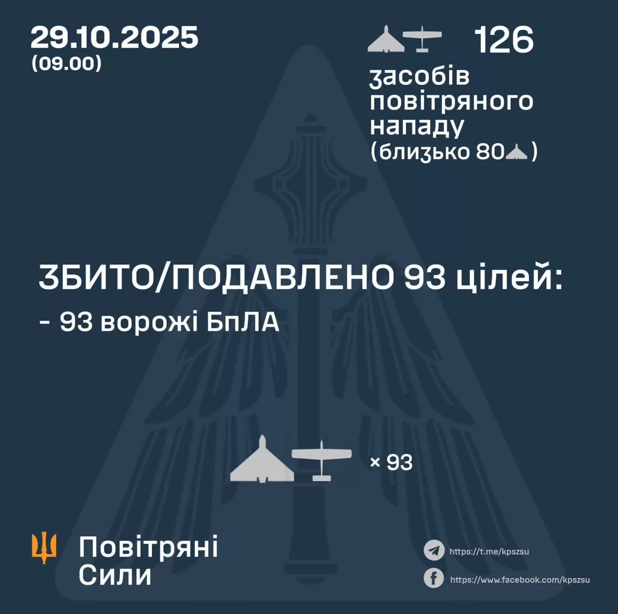За попередніми даними станом на 9:00, українська протиповітряна оборона збила або подавила 93 ворожі безпілотники типів Shahed, “Гербера” та інших. Основні напрямки атаки — північ і схід країни.